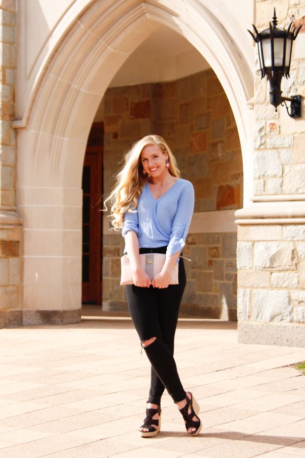 This outfit I’m wearing is another way to transition your wardrobe from winter to spring. I can’t get enough of wearing these distressed jeans, which are great to wear throughout the year. I paired them with a silky, light blue wrap top, and added a color pop of orange with my earrings and clutch. I almost never think to pair something like blue and orange together, but it was one of those days where I grabbed the earrings and clutch and ran out the door. I love when it works out that way, or you have a vision of something in your head and it actually comes out as great as you imagine! In winter or fall I would opt for booties, but wearing wedges gives this outfit more of a spring vibe. I found the wedges at DSW for like $20. If you’ve never been to DSW, it’s worth going and hunting for hidden gems. I’ve even found last minute NYE gold pumps there literally on the night of NYE for $10!