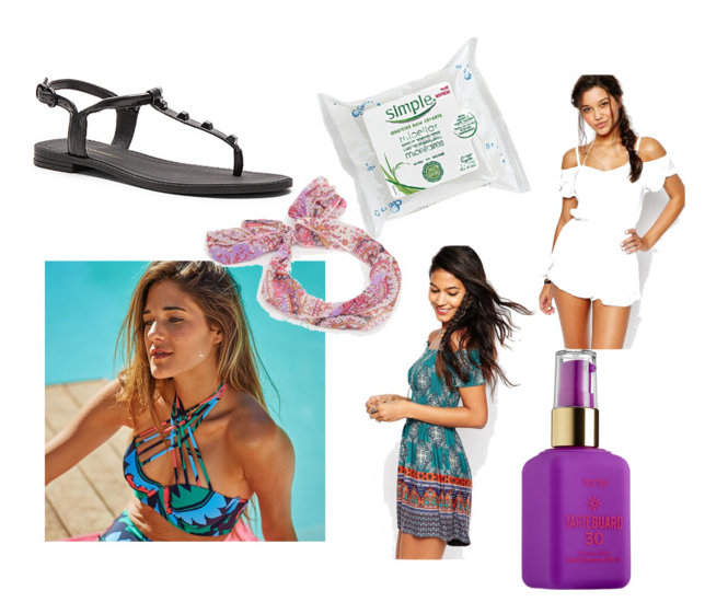 Sandals | Simple Micellar Water Makeup Wipes | White Romper | Swimsuit | Head Wrap | Patterned Romper | Tarte Sunscreen